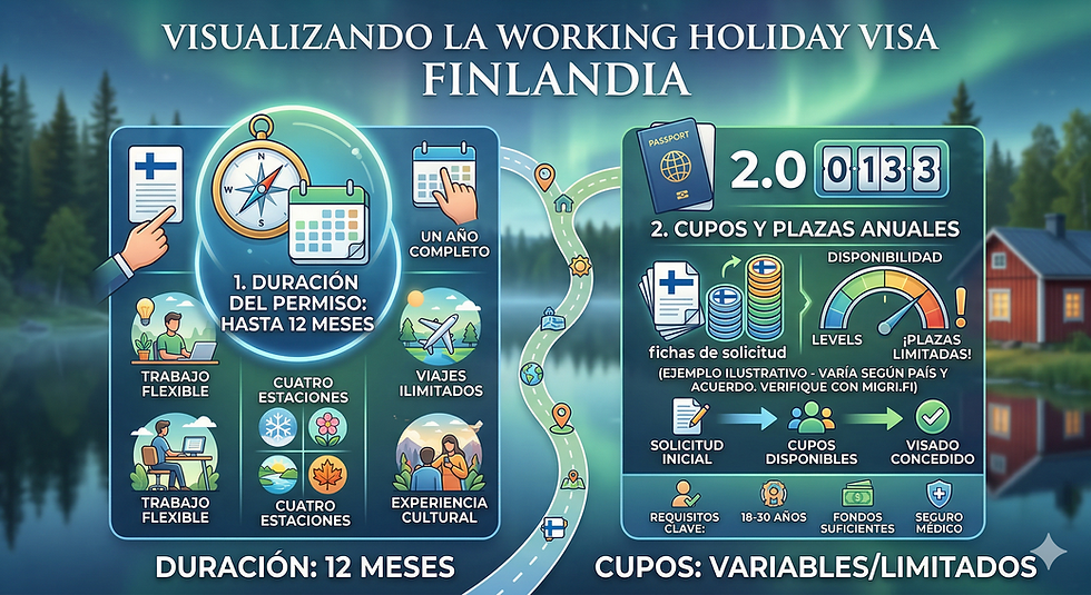 El Servicio de Inmigración de Finlandia (Migri) no aplica un sistema de cuotas restrictivas ni techos máximos de vacantes anuales para los ciudadanos de Australia, Canadá, Japón y Nueva Zelanda bajo sus acuerdos bilaterales. Al tratarse de cupos ilimitados, el programa garantiza que no existe un límite numérico de vacantes ni competencia por los lugares para estas nacionalidades.